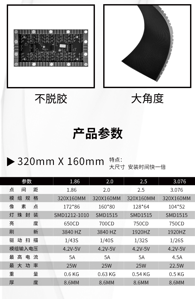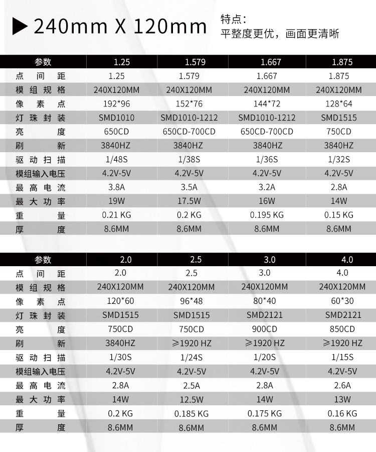标准尺寸设计,低电流,低热量,搞对比度,高亮高灰,刷新3840Hz,真16bit灰度等级,搭载SMD1212黑灯,黑屏整屏暮色完全一致,像素吻合1920*1152/3840*2304,2K/4K分辨率,播放高清视频,达到最完美播放效果。