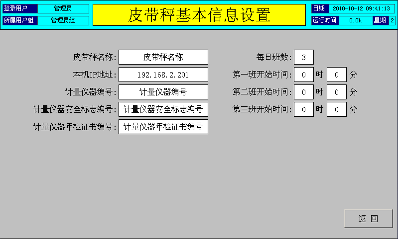 在该窗口中,可设置皮带秤的名称,修改本仪表的IP地址,设置每日班数及每班对应的时间等。